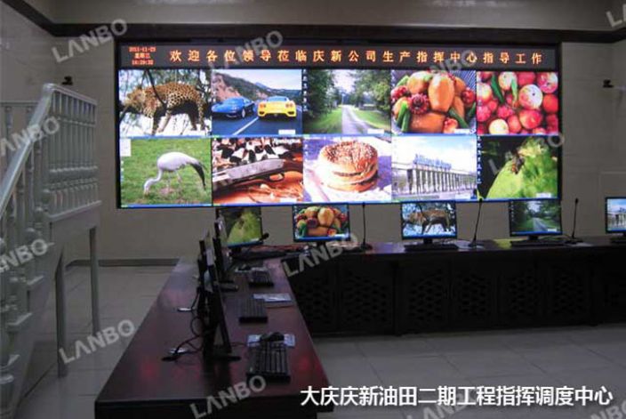 大庆庆新油田二期工程指挥调度中心采用LANBO DVS67显示单元2×5(LED光源,显示尺寸6.8米×2.04米)拼接组成的大屏幕显示系统。