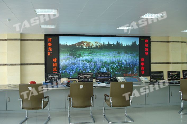 河北首秦龙汇矿业集团采用9套50英寸和12套50英寸DLP投影单元拼接而成,图形控制部分采用2路RG输入,9路复合视频输入,视频矩阵采用64路输入,16路输出型,VGA矩阵采用16路输入4路输出型,两侧配有双基色3.0LED电子显示屏。