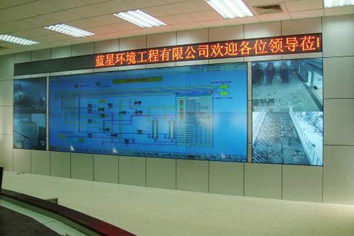 北京亦庄开发区污水处理厂DLP拼接墙大屏幕显示系统,于2010年11月初开始设备安装及调试,整套DLP拼接墙大屏幕显示系统包括12套67英寸显示单元,1台多屏图像处理器,LED条屏。DLP拼接墙大屏幕分成两部分,中间为一套2*4的DLP拼接墙,两侧的两套屏幕可单独工作。现以调试完毕。