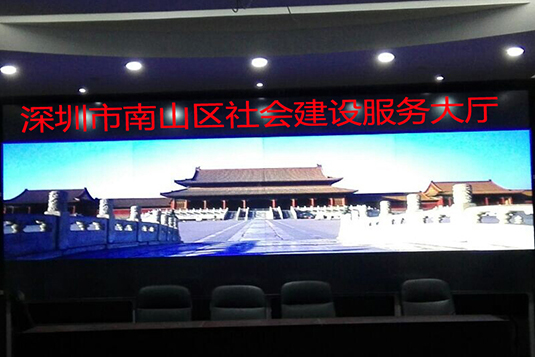 中电视讯CECV为深圳市南山区社会建设服务大厅提供了新一代光源--激光光源DLP投影显示单元拼接墙,系统建设规模为2行4列8台67英寸4:3高清高亮DLP拼接墙。