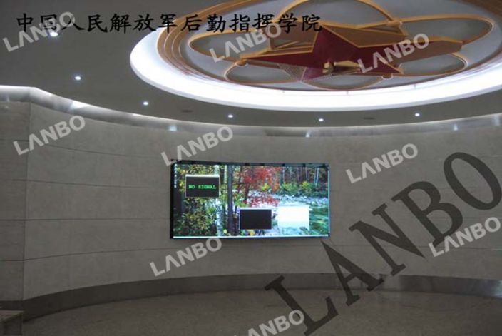 中国人民解放军后勤指挥学院DLP拼接屏由北京环宇蓝博科技有限公司承建。该DLP拼接屏由50英寸2*3直投DLP拼接,作为部队训练成果展示,设备安装在一个正圆形展示厅,所以需要中间屏幕突出很多(大于500mm)所以采用直投箱体。