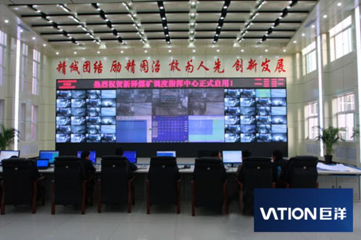 基于新驿煤矿的现有情况和实际需求,巨洋(VATION)为其量身定制了一套由巨洋自主生产全球首发的 4x6 24块 60寸LED-XGA-DLP大屏幕显示产品,大屏两侧各24块液晶拼接;由于煤矿安装的视频信号多,特意设计了V-NET服务器用于视频信号的扩展;另外还有RGB矩阵,满足电脑信号的使用。长期以来,灯泡的频繁更换所带来的经济负担、繁重的维护任务及灯泡损耗所带来显示效果的下降已经成为DLP大屏幕系统在煤矿调度中心的瓶颈,严重制约DLP大屏幕系统在煤炭行业的推广及应用。LED光源寿命高达60000小时,彻底解决了普通灯泡所带来的问题,为煤矿调度中心提供真正的免维护产品。巨洋(VATION)率先将LED光源产品引入新驿煤矿调度中心,成为目前煤炭行业最大规模的LED光源产品拼接墙。