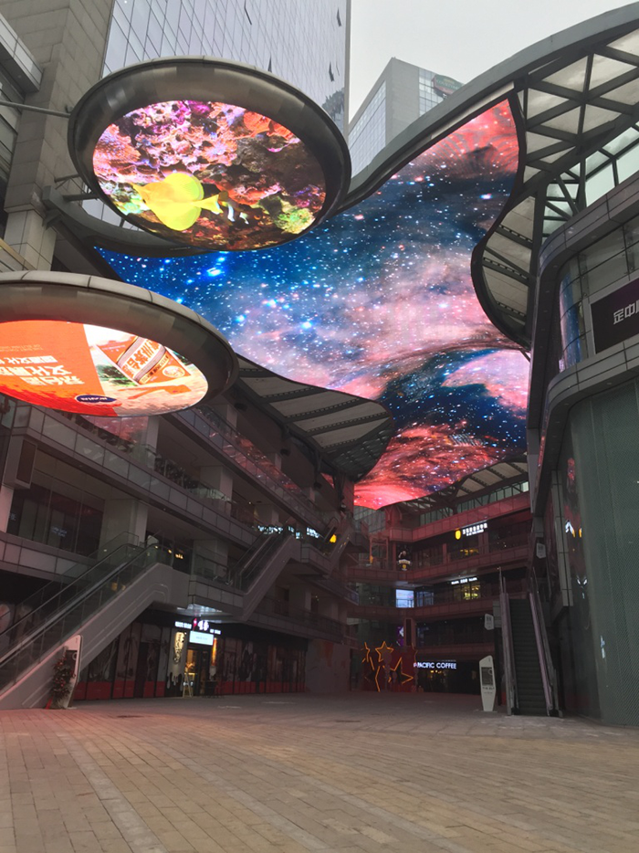 奥拓立翔相似的案例,还有位于珠海华发商都的8000平方米的创意型LED天幕,是全球首例的LED异形天幕。