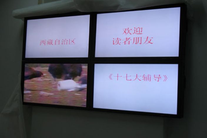 拉萨市西藏区新华书店LCD液晶拼接屏大屏幕显示系统由北京双旗世纪科技有限公司承建。双旗世纪推荐用户选用了夏普IDP专业LCD液晶拼接显示屏,采用4台PN-465型专业LCD液晶拼接显示屏,组成2×2LCD液晶拼接显示系统。PN-465可以显示数字PC,模拟PC以及数字AV(通过HDCP兼容的DVI接口)的1080P信号。采用FULLHD顶级夏普全高清液晶屏,具备1920×1080分辨率,具有高亮度,高对比度且视角宽广的特点,带来真彩重现的动感视觉效果和大屏幕式的清爽文字图像。这些先进技术和性能都很好的满足用户工程的要求。