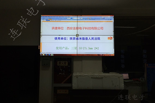 连联电子为陕西榆林市米脂县人民法院打造的55寸2x2液晶拼接系统正式投入使用;在合作前期,连联电子技术工程师对人民法院实际安装液晶拼接屏环境进行了实地考察,人民法院显示系统对重要信息的公布肩负着的重大责任,这就对信号传输、显示画面以及整个产品质量有着严格的要求。