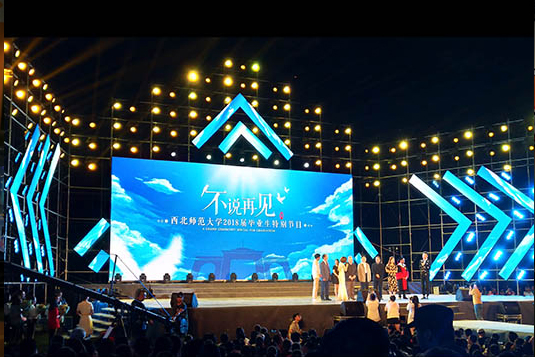 该屏应用于西北师范大学2018届毕业生节目表演中,采用P4.81的规格,面积:120㎡,亮度:3500nit,使用地点甘肃兰州。