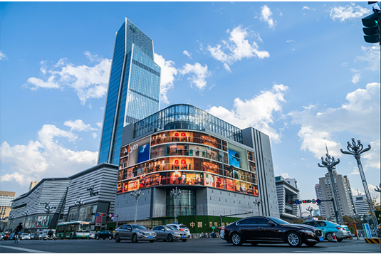 云南昆明金格百货商城是一栋具有一定年头的建筑,如今已焕然一新。超过1400㎡艾比森户外LED显示屏的嵌入为大楼焕发新的活力,让这栋坐立于城市核心CBD商圈的旧建筑发挥更大的广告价值。