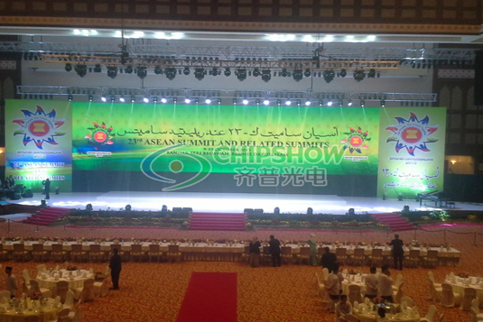 会议现场安装了两块高清LED显示屏用于现场直播,均由深圳市齐普光电子有限公司提供。其中一块是P4户内高清全彩LED显示屏,面积为23.3平米,另 一块为P6户内高清全彩LED显示屏,面积为153.35平米。针对高端会议LED显示屏,齐普光电有丰富的经验,2012年的欧盟EPP会议,就是采用 的齐普光电P5户内LED全彩显示屏,效果不同凡响。同样,此次的东盟峰会,效果也绝非一般。