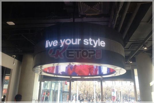该店位置靠近北京工体,知名酒吧鳞次栉比,是北京时尚潮人、80后、90后最常去的地方。这座异型玻璃外墙建筑在周围环境中尤为显眼,进入大门映入眼帘的就是锐拓制造的P10户内圆周造型显示屏,安装在一楼入口处顶部,内圆屏幕面积7.5㎡,外圆3㎡。