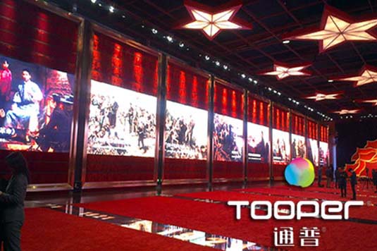 天津时代纪念馆时光隧道两旁分别由9块面积为18.35平方的R576-4室内全彩LED显示屏组成,总面积达330.3平方米。通过LED显示屏,可以生动陈列出具有时代特征的纪念物品和珍贵照片,让观众可以更真切了解放时代,达到来传承红色文化,弘扬爱国精神。