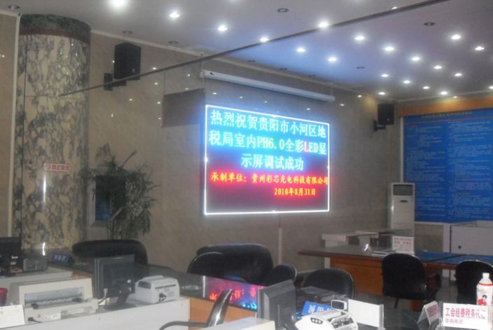 贵阳小河区地方税务局室内全彩LED显示屏由贵州彩芯光电科技有限公司承建。该室内全彩LED显示屏信息发布系统采用了P6规格,面积20平米,成为贵阳小河区地方税务局信息发布的重要平台,是室内全彩LED显示屏在政府机关信息发布应用的一个工程案例。