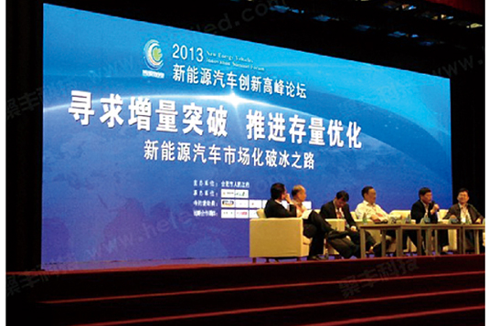 此显示屏是由福建华杰彩亮有限公司承建。该室内全彩LED显示屏大屏幕系统采用了P5规格,LED显示屏面积30平米,为2013新能源汽车创新高峰论坛提供了便利。