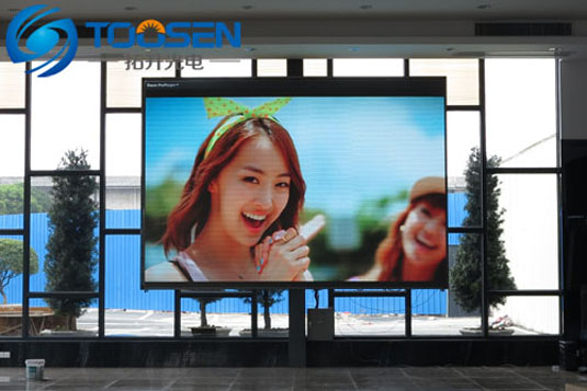 顺德房地产售楼处室内全彩LED显示屏采用P5规格,面积14.8平米。