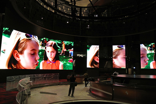 利亚德MV4像素间距为4mm,采用士兰全彩SMDLED灯。屏体由不同数量的MV4箱体组成大小不同的弧形屏幕,同时使用了利亚德领秀3G Player和领秀3GLED Processor。