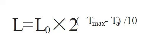 仅以电容器为例, 不考虑纹波、频率、ESR 等因素, 电容器的估计寿命可用下述公式表示: