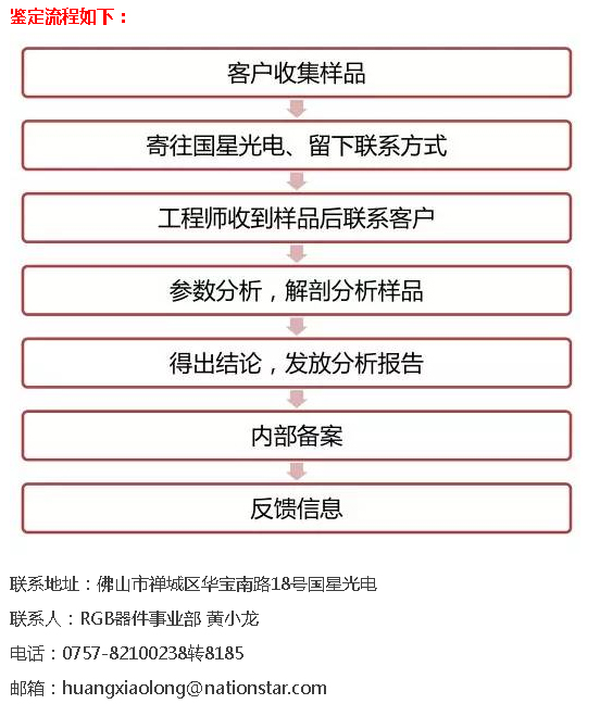 为了更好地维护合作伙伴的利益、保障终端消费者的权益,国星光电RGB器件事业部特别成立了LED全彩器件产品检测鉴定中心,为客户提供免费的产品鉴定服务,并承诺在收到样品5个工作日内予以答复。
