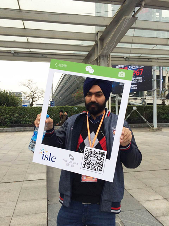 来自印度的Raj Sanjeev是广交会多年的老客户,在2015的广交会了解到ISLE展会,2016年2月如期造访,希望在展会上找到一些合适的户外广告标牌供应商。此外,Raj对我展在现场推行的“@ISLE_GZ”活动饶有兴趣,关注ISLE的LinkedIn,脸书,Instag等账号后拍照留念。
