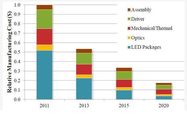 讨论集中在LED封装制造工艺和使用成本较低的材料,具体而言,从2012年封装LED吞吐量每年增加2倍,每2~3年减少50%的装配成本(cost/klm)、每2~3年减少50%的包装成本($/平方毫米)、每2~3年每包成本($/klm)减少50%。