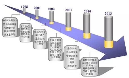 为了更好的了解各个技术每年的发展状况,我们采用ThemeScape专利地图对每个技术点在不同时间段进行分析,绘制了外延、芯片、封装的技术发展路线图,从图6-8中可以看出1998年至2013年外延、芯片、封装等技术每3年发展的侧重点和相关申请专利量分布。