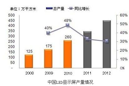 2010年中国LED显示屏总产量260万平方米,同比增长48%。其中,按生产面积先后顺序排列分别为LED全彩屏、LED单色显示屏、LED双色显示屏。三个类别的显示屏面积差别不大。预计,2011年LED双色显示屏生产面积有望超过LED单色显示屏。