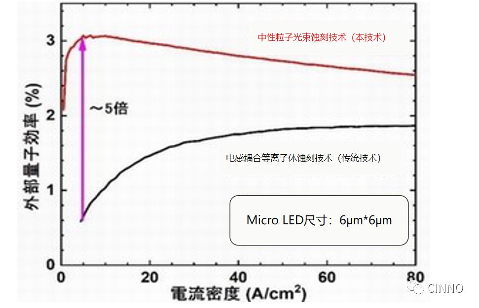 此外,关于6μm的Micro LED,当电流密度为5A/cm2时,比较了采用两种技术后的发光效率。结果,利用中性粒子光束蚀刻技术试做的产品的发光效率几乎是ICP蚀刻技术的5倍。