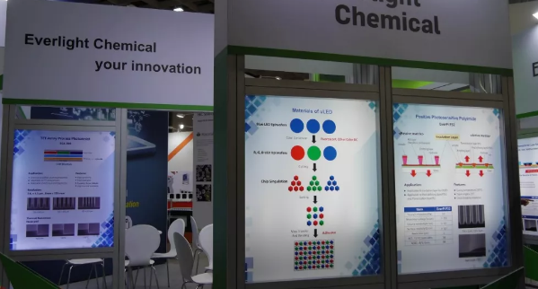 材料厂商永光化学展示可用于Micro LED接合在玻璃面板的黏合材料,而诚美材料则展出一系列的胶材,包含应用于Micro/Mini LED面板的UV型遮光胶及LED背光的UV型反射油墨。