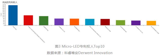 图3为Micro-LED主要专利分类号及对应的专利数量。根据国际专利分类号IPC统计分析发现,Micro-LED领域技术主要都集中在半导体发光器件领域(分类号:H01L)。进一步查阅专利文献发现,专利技术的焦点是Micro-LED器件及制造工艺。