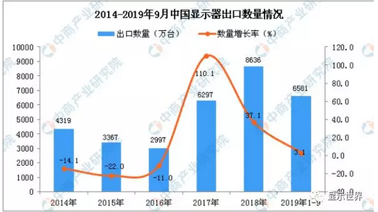 据中商产业研究院数据库显示,2017-2018年中国显示器出口量明显大幅度增长,2018年中国显示器出口量增长37.1%。2019年1-3季度中国显示器出口量为6581万台,同比增长3.1%。