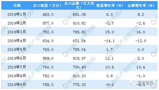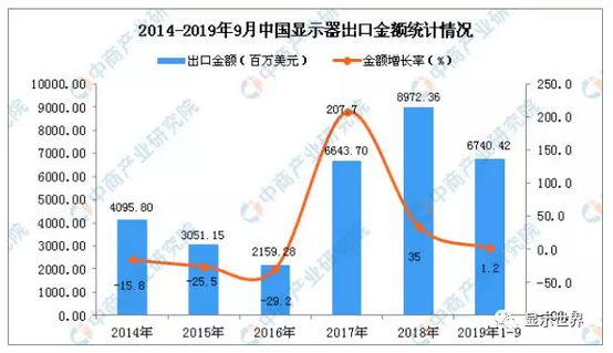 从金额方面来看,2019年1-9月中国显示器出口金额为6740.42百万美元,同比增长1.2%。