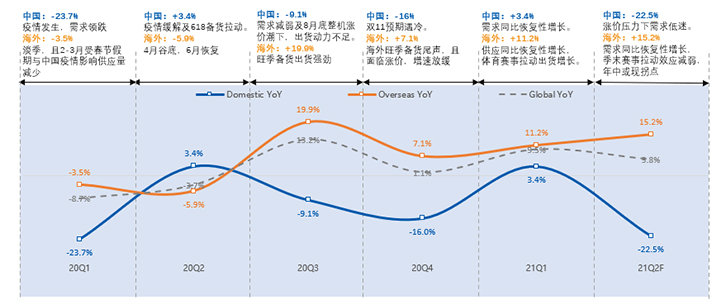 20Q1-21Q2F全球TV品牌内外销出货同比变化
