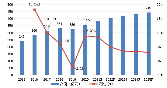 图表1 2015-2025年中国LED通用照明市场市场规模情况及预测(单位:亿元,%)