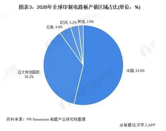 在全球PCB行业市场区域方面,根据PR Newswire统计数据,2020年亚太地区的市场占全球市场总额的90%,其中中国大陆的PCB市场规模占据全球市场总额的约53.8%;在北美和欧洲,2020年PCB市场份额占比分别为4.8%和3.2%,占比非常少。