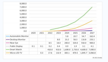 市场研究机构Omdia预计,到2025年,micro LED显示器的出货量将达约500万片,将产生约70亿美元的收入。到2027年,该市场的收入将增长到超过110亿美元。但是,与整个显示器行业的市场规模(估计超过2000亿美元)相比,这还是处于相对较低的水平。