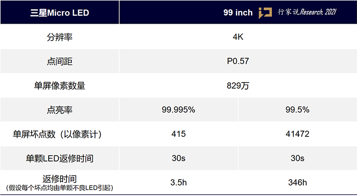 如上表所示,110英寸Micro LED电视的像素与99英寸Micro LED电视的像素数量为829万个,据了解,110英寸Micro LED电视的RGB三色LED的转移总良率约为99.9%,则单屏有8294个坏点。如果采用返修每颗LED速度为30秒的返修设备,在假设每个不良像素点是由一颗LED坏点引起的情况下,把所有坏点的修复时间加总,为69小时。