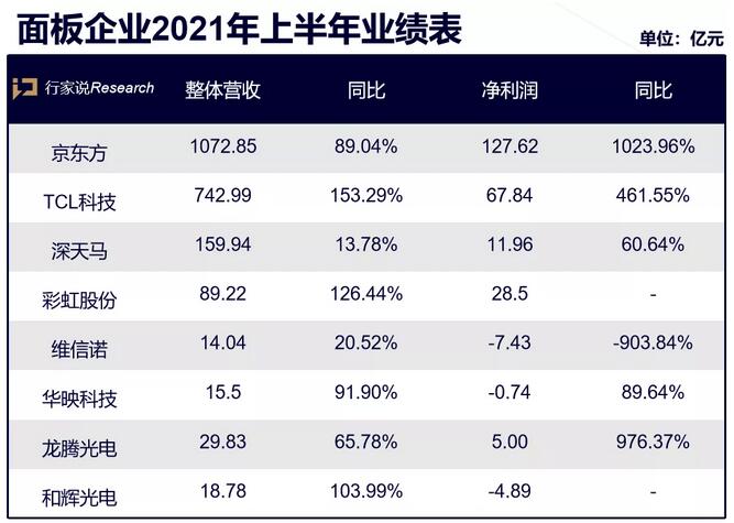 今年上半年,几家重要面板企业在营收方面均有一定增长,其中,TCL科技、彩虹股份、和辉光电整体营收涨幅上升超100%。