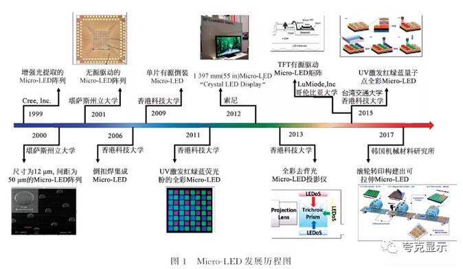 Micro LED显示技术是继蓝光GaN材料和白光LED照明之后LED领域的最重要进展之一。图1简单回顾了Micro LED的发展历程,从中可以发现这一领域重要进展都是来自于集成工艺的突破。可以预期,未来Micro LED显示的发展仍将朝着微缩化、集成化、阵列转移化和全彩化进一步发展。