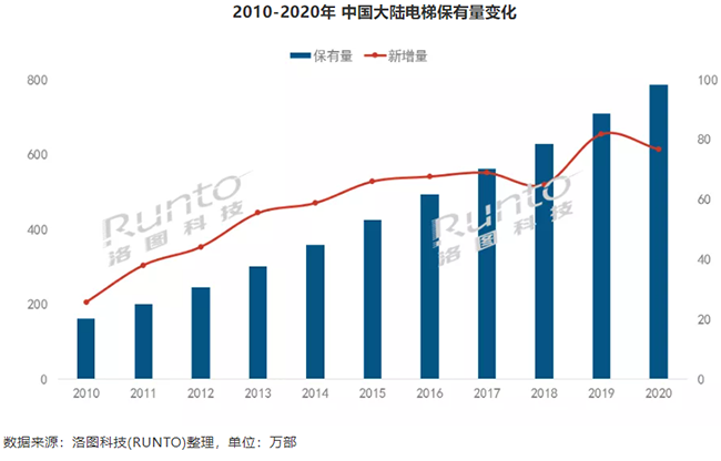 2020年,中国大陆新增电梯77万部,达到了787万部。而十年前的2010年,中国大陆电梯保有量仅为163万部,预测2021年将新增约100万部。