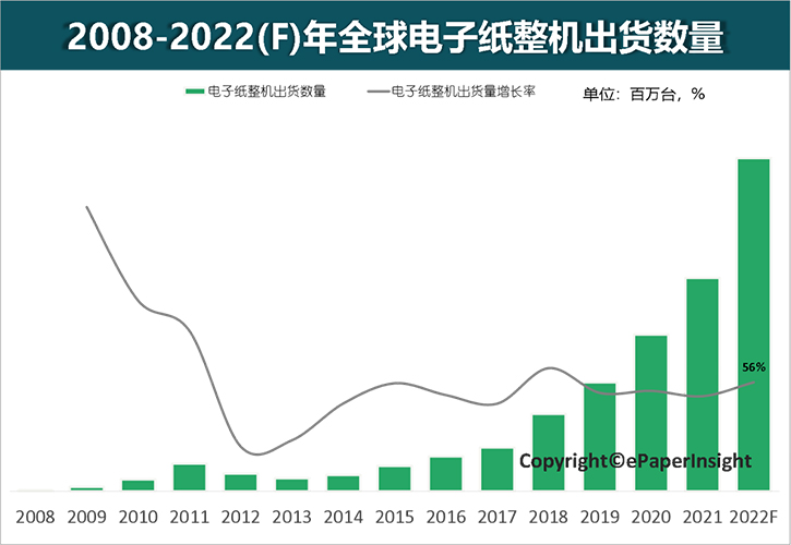 ePaper Insight预测,2022年全球电子纸整机出货数量将近2.8亿台(片),增长率将高达56%。相信随着电子纸技术的不断发展与突破,将会有更多行业性应用的突破,电子纸产业也将持续蓬勃发展。