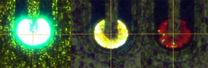 图2. Kubos半导体制作的直径为50微米的绿色、琥珀色和红色Micro-LED器件。目前他们正在努力提高红色LED结构的发光效率(资料来源:Kubos半导体)