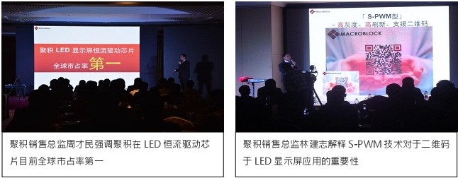 透过此次机会,聚积科技与终端租赁商有直接面对面的交流。在演讲内容上,聚积销售总监周才民提到:「这次着重于介绍聚积科技本质上的特色,包括经过十多年的努力,成为世界首屈一指的LED恒流驱动芯片的供货商;另外即是聚积在LED显示屏驱动芯片上最重要的技术S-PWM。S-PWM相对于传统驱动芯片,在技术上有很大的突破,具以下三大优点: 1.提升视觉刷新率64倍以上;2.提升颜色灰阶;3.避免产生高频电磁干扰( EMI )。尤其租赁屏常需要在舞台上使用,若有人使用相机拍照,无论在刷新率或是在灰阶表现上,S-PWM都可达到一定水平,让画面维持美感,不会出现扫描线或是掉灰;另外,低EMI才能够确保不会造成音响和收音的干扰,对于租赁屏厂商而言,都是相当重要的关键。」
