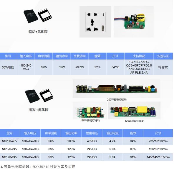 面对氮化镓SIP封装器件复杂的制造程序,以及鲜有可参考的技术产品案例,国星光电充分利用自身在LED封装领域的多年经验与优势和在第三代半导体的潜心研究,积极攻坚技术壁垒,成功开发出多款基于SIP封装的氮化镓IC产品,并配套开发出相应的氮化镓驱动方案,可在LED照明驱动电源、LED显示器驱动电源、墙体插座快充、移动排插快充等领域得以应用。