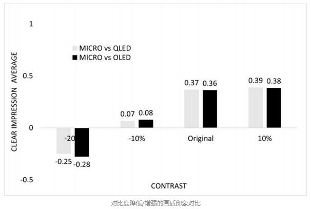 对比度则有很大的影响。当对比度降低10%时,8K电视与Micro LED对比效果相近。当它被减少了20%,评估结果表明,高分辨率显示器具有了更清晰的图像质量,当比原始印象增加+10%时,实验者的清晰印象仅略有增加。