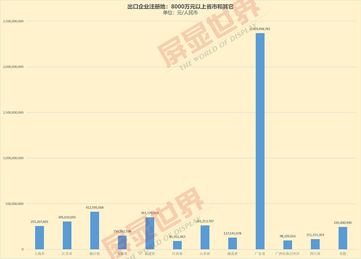 出口额超过8000万元的企业注册地有:北京市、天津市、上海市、江苏省、浙江省、安徽省、福建省、江西省、山东省、湖南省、广东省、广西壮族自治区、四川省。其中珠三角、长三角、闽三角、京津地区仍然是我国LED显示屏产业化重要基地。