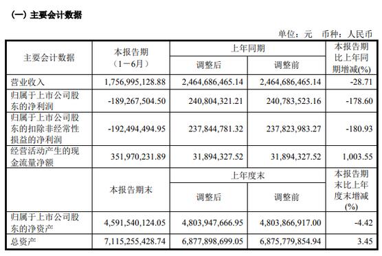 龙腾光电(688055)8月29日晚间发布半年报,上半年实现营业收入约17.57亿元,同比下降28.71%;净利润亏损约1.89亿元,去年同期实现净利润约2.41亿元,同比转亏。