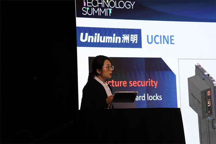 美国SMPTE 2023峰会,中国电影科学技术研究所联合洲明科技组成“中国电影技术交流代表团”,多方位呈现中国自研LED电影屏产品及整体技术解决方案。图为高新技术研究处副处长王萃王萃以洲明为例,分享“LED电影放映技术的中国方案”。