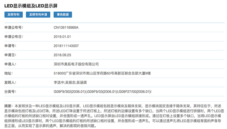 从以上表格可见,目前涉及的LED屏透声技术主要为实用新型,其中奥拓电子于2018年获得了一款发明专利。