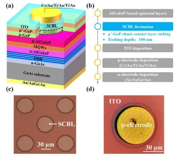 上图为 (a) 器件结构,以及 (b) 基于 AlGaInP 带有SCBL的红光垂直结构Mini LED 的制造工艺流程。(c) SCBL 和 (d) 基于 AlGaInP 的红光垂直结构Mini LED顶视图光学显微镜图像。