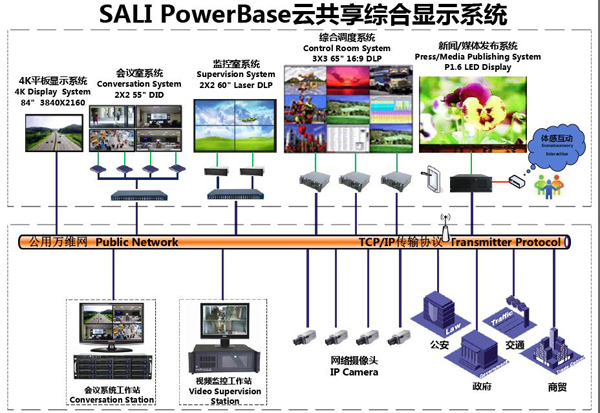 整套系统设计理念:采用 SALI PowerBase云共享综合显示系统: 针对公安、政府、交通、教育、商贸中心等公共信息平台,通过万维网实现信息的共享,所有展示大屏按照应用场景设计,分别为:综合调度系统、监控室系统、会议室系统、新闻媒体发布系统、4K平板显示提供,通过SALI研发的分布式以及多群组式控制器系统,实现各类信号的跨屏显示,交互应用。