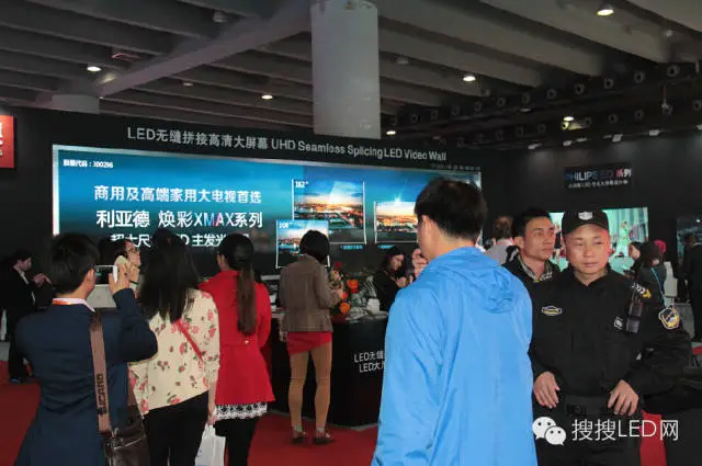 利亚德的展位以黑色调为主,其展出的主打产品是无缝拼接大屏幕。利亚德可以说是最早生产小间距产品的一个企业,其小间距产品也已经广泛运用在军事、政府机关、企业视频会议等场所,其推出的LED小间距电视也已经网上在售了,其实力不容小觑。
