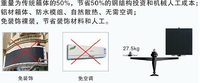 3)节省资源和投资——单箱重量27.5kg,传统P10产品的50%;防水模组,自然散热,不需要安装空调;钢结构+箱体的裸露安装方式,不需要再进行装饰。
